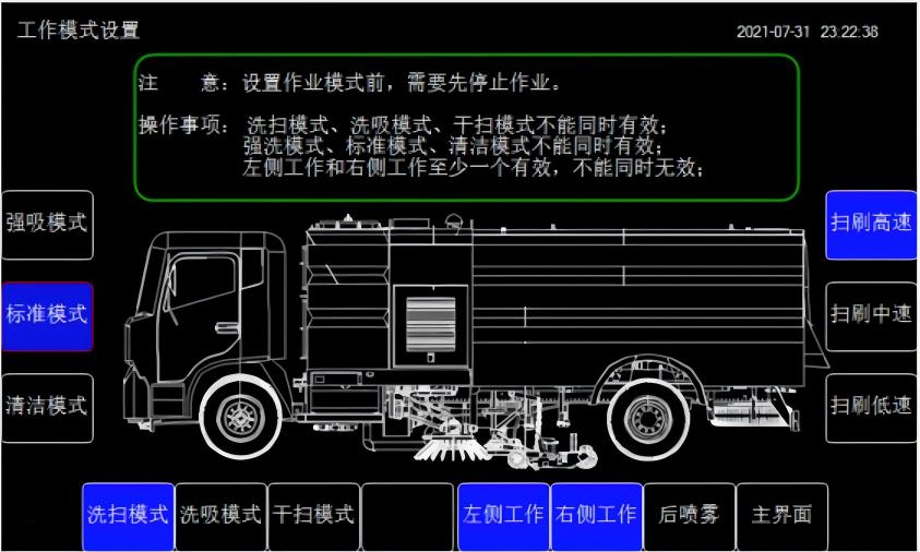 路沿和路沿石立面洗刷:利用掃盤的左或右立掃,左或右噴桿上的路沿石清洗噴嘴,選用左或右洗掃作業(yè)模式進(jìn)行洗掃作業(yè),就可對左或右路沿與路沿石立面進(jìn)行洗刷作業(yè)。