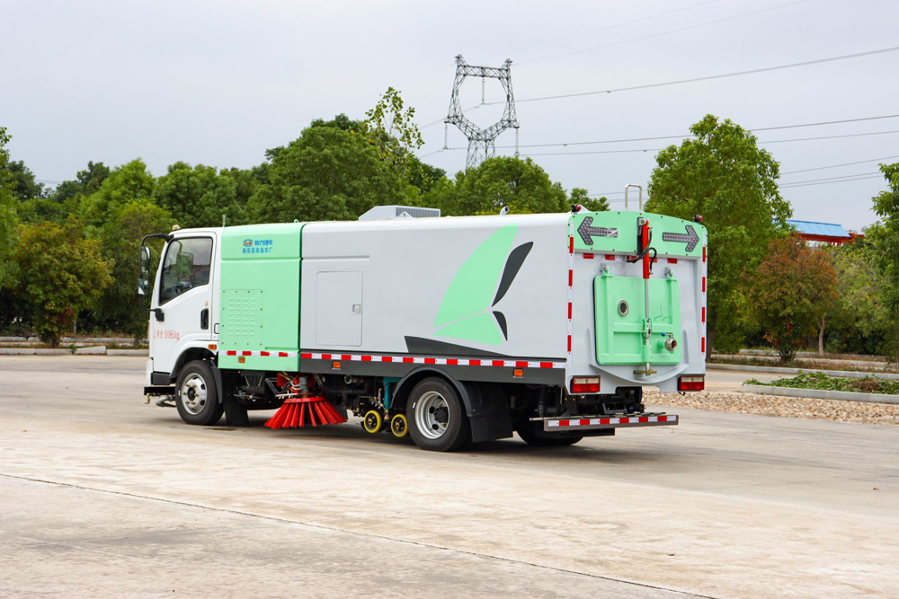 該洗掃車的清掃系統采用“中置兩立掃+中置寬吸嘴+吸嘴高壓中噴桿+左、右高壓側噴