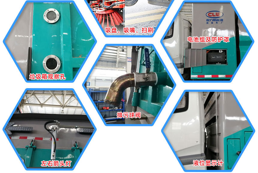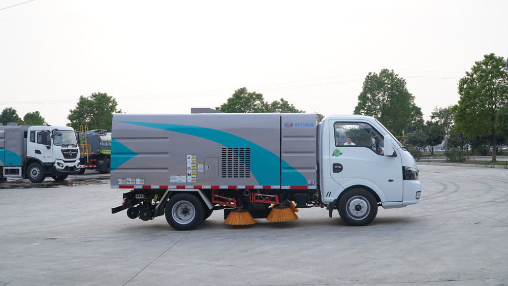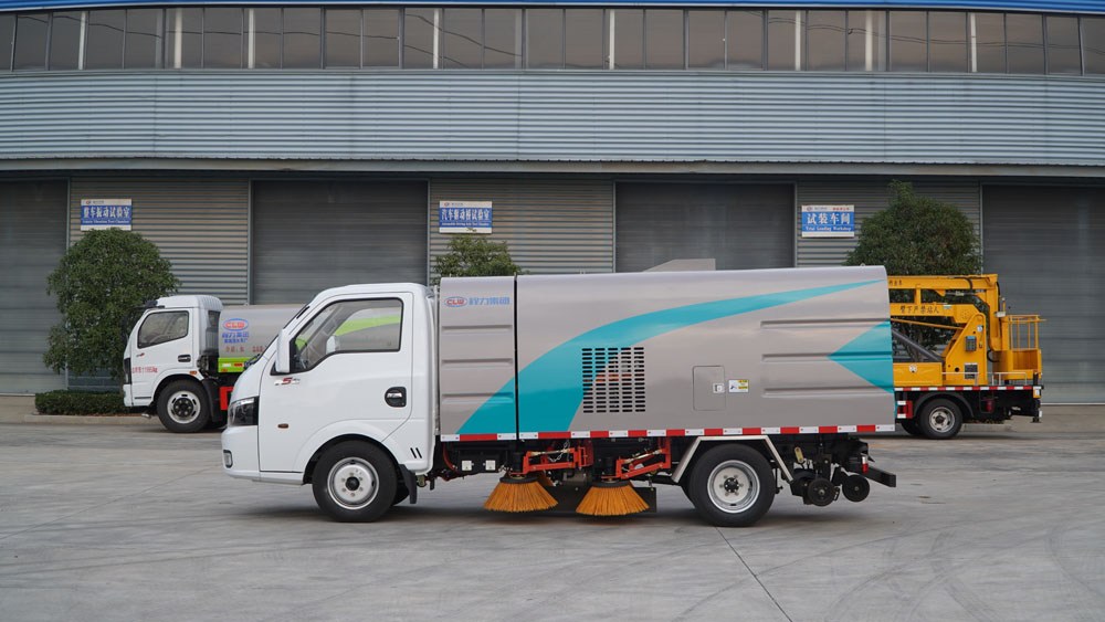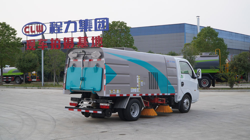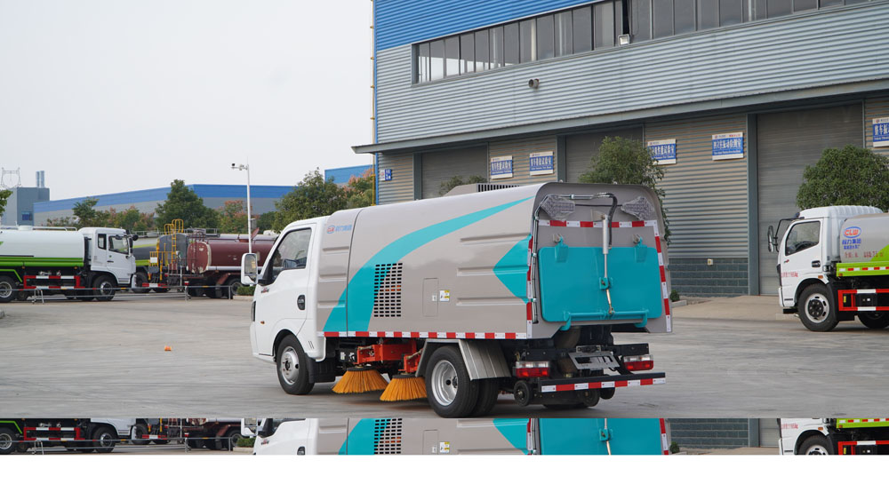 3、掃路車采用東風純電動二類汽車底盤改裝,加裝風機、清水箱、垃圾箱、左右立掃、帶噴水桿的寬吸嘴、掃盤降塵系統(tǒng)、液壓系統(tǒng)、專用裝置電控系統(tǒng)和副車架等改裝而成。