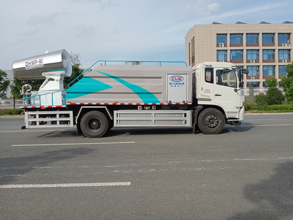 四、其他說明: 東風(fēng)天錦純電動(dòng)抑塵車車是在純電動(dòng)二類底盤的基礎(chǔ)上,加裝低壓沖洗、灑水系統(tǒng)、霧炮機(jī)組,由機(jī)械、液壓(氣路)、電器三部分合為一體的專用灑水作業(yè)車。工作原理:采用自吸式雙級(jí)離心泵,效率高、灑水寬度大、水槍射程遠(yuǎn),低壓水泵由底盤變速器取力器通過傳動(dòng)軸直接傳動(dòng)。霧炮機(jī)組由底盤電池帶動(dòng)霧炮風(fēng)扇電機(jī)、不銹鋼多級(jí)離心泵,進(jìn)行噴霧降塵工作。