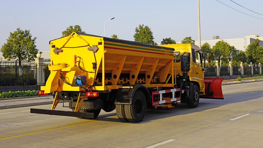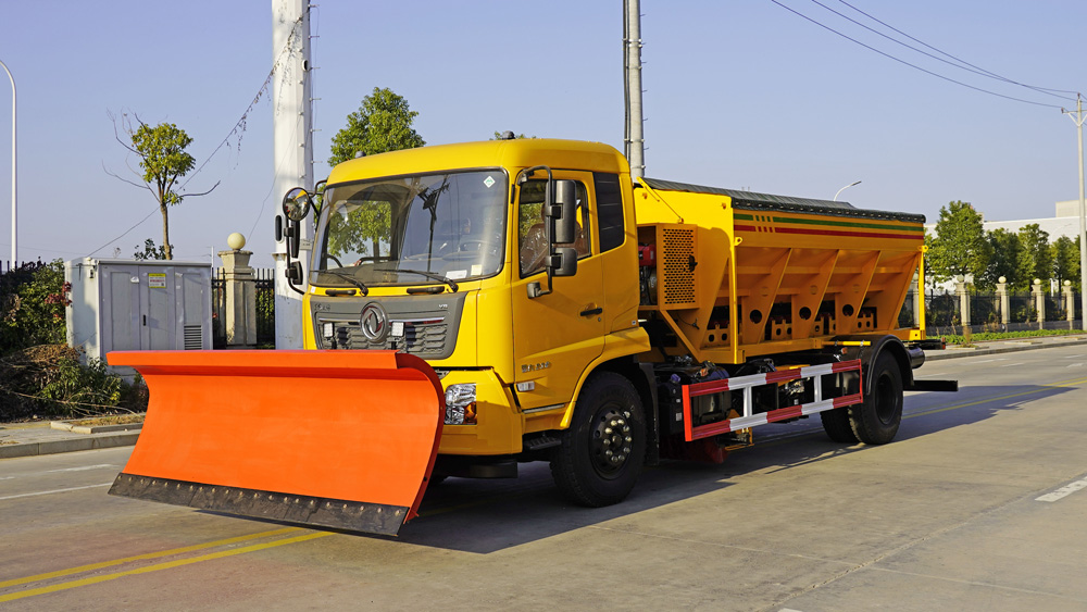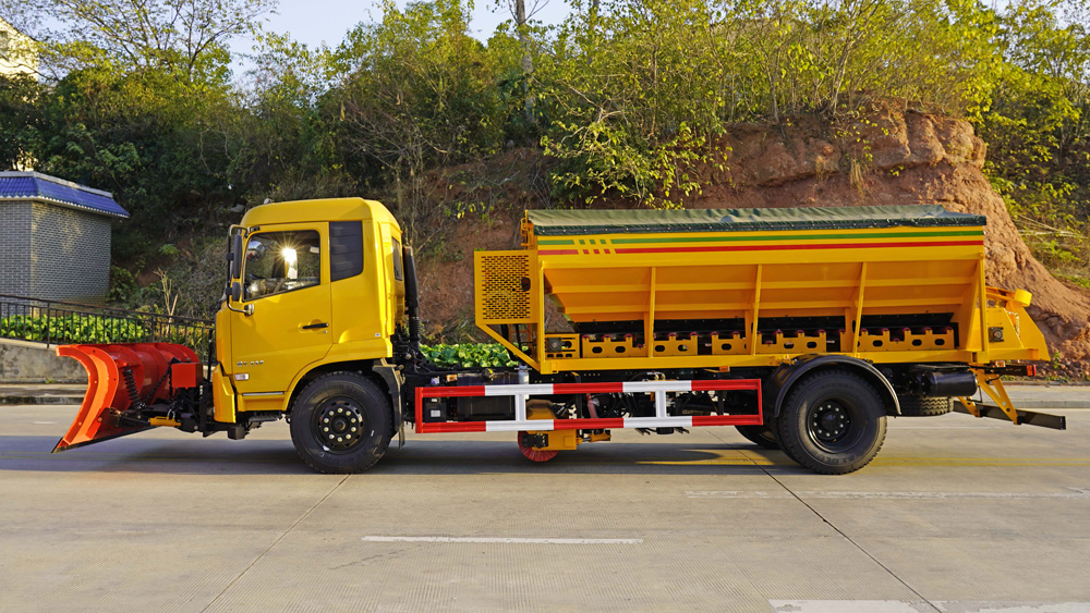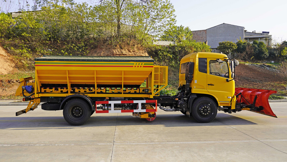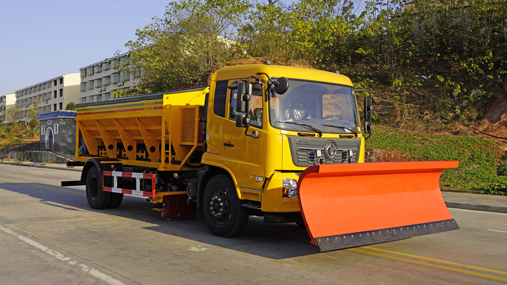 四、其他說明: 東風天錦多功能除雪車,集掃雪、推雪、吹雪、撒布等多種功能于一體,可通過更換不同的作業裝置,如除雪鏟、掃雪滾刷等,滿足不同場景下的除雪需求,有效提升掃雪鏟冰的工作效率和作業質量.