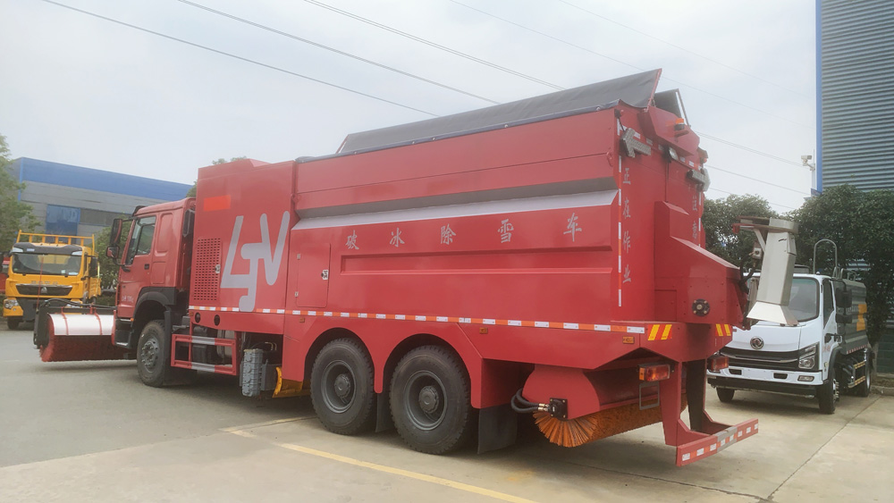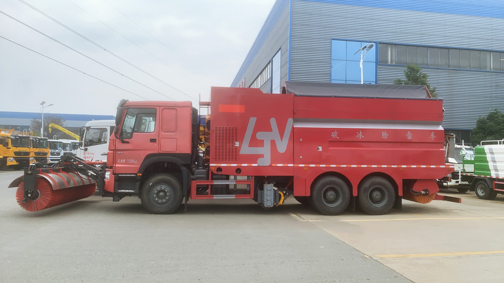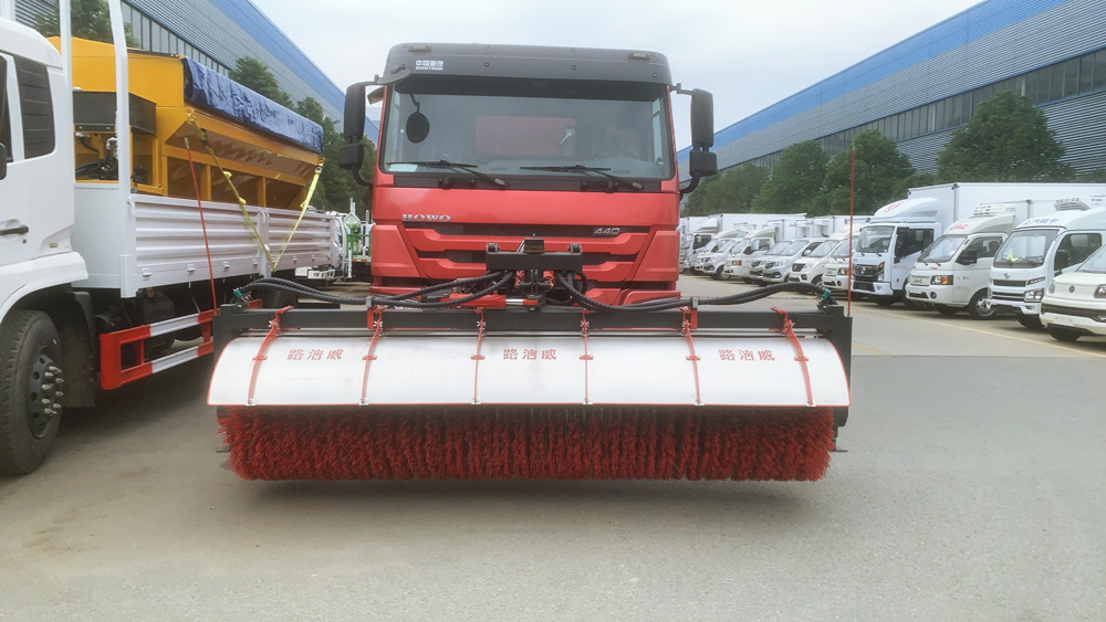 四、其他說明: 該車用于冬季撒布融雪劑;主要專用裝置為撒布機、破冰機、雪鏟和滾刷; 僅采用4625+1350mm軸距底盤,整車長為10680mm時,前伸為180mm; 側后防護材料均為Q235,均采用螺栓連接,后防護截面尺寸150mm×50mm,下邊緣離地高350mm,選用輪胎型號:11.00R20 18PR,12.00R20 16PR; 該車安裝有工作警示燈,后部箭頭燈僅在作業狀態下開啟; 后懸架僅采用鋼板彈簧懸架.
